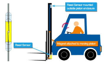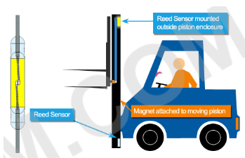 需要進行終端位置檢測的活塞通常是由數(shù)百萬個機械系統(tǒng)組成。這些系統(tǒng)包括卡車升降機,犁,垃圾車,叉車、特種機械車等。在大多都是骯臟惡劣的環(huán)境中會影響開關裝置的開啟和密封性,可能引起故障切換,停機甚至在使用中發(fā)生故障時會產(chǎn)生昂貴的修理費。為了避免這些故障,設計人員剔除了不可靠的機械開關,轉(zhuǎn)而使用干簧傳感器,因此極大提高了系統(tǒng)的可靠性。