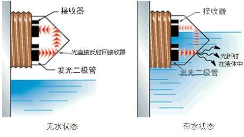 光電式液位傳感器精度高、穩定性強且適用范圍廣,而干簧管液位傳感器則是精度低,可靠性差,易出現不良的現象。光電式液位傳感器采用光學反射的原理來測量,根據輸出的高低電平判斷液位的高低變化。